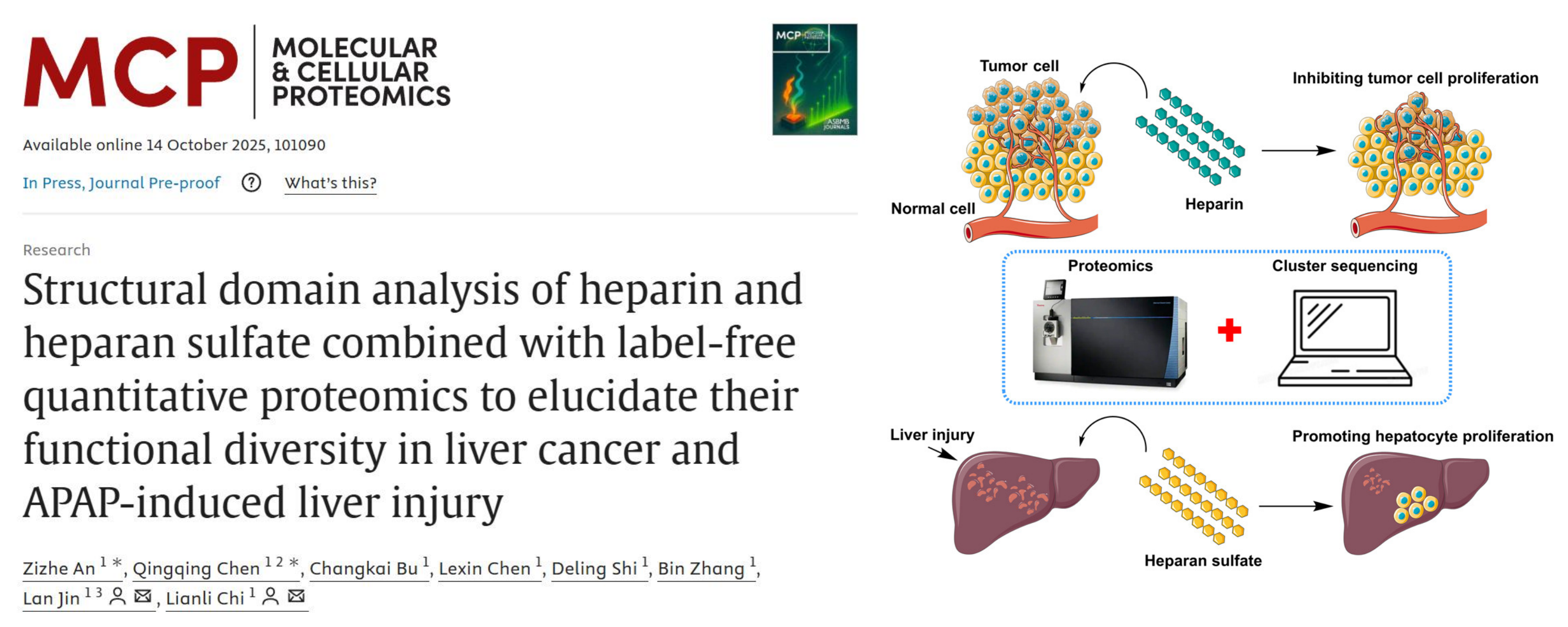 近日,国家糖工程技术研究中心迟连利教授团队在低分子肝素/低分子硫酸乙酰肝素干预肝癌和急性肝损伤的不同分子机制方面取得研究进展,以“Structural domain analysis of heparin and heparan sulfate combined with label-free quantitative proteomics to elucidate their functional diversity in liver cancer and APAP-induced liver injury”为题,在Molecular & Cellular Proteomics发表了最新研究成果(DOI:10.1016/j.mcpro.2025.101090)。