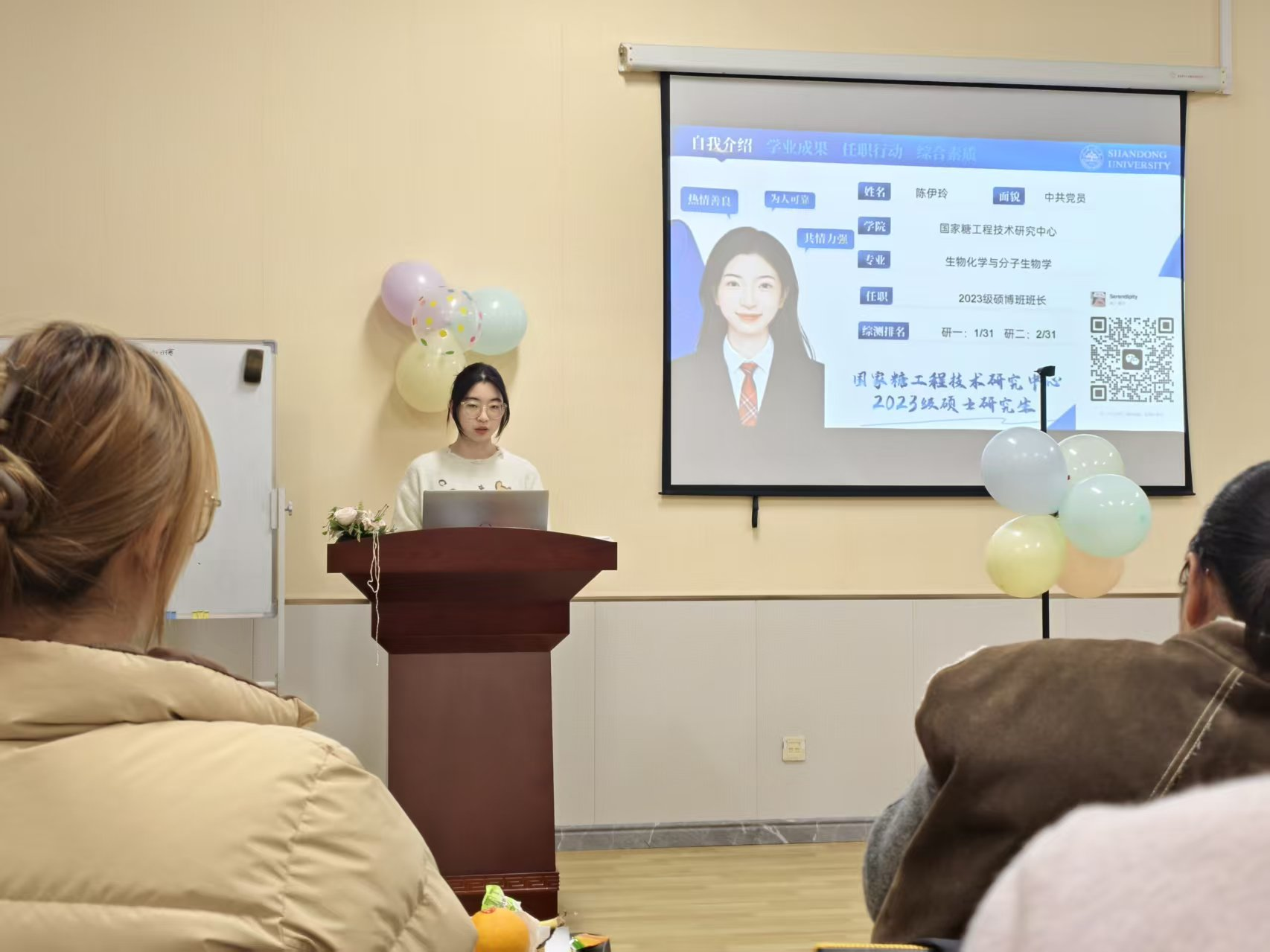 随后,中心学生党支部党员代表、国家奖学金获得者陈伊玲进行分享。她结合自身学习、科研与生活实践,分享如何在压力中保持积极心态、高效管理时间、建立支持系统,并鼓励同学们主动融入集体、勇敢表达自我、积极寻求资源。她的真实经历与务实建议,增强了新老生之间的情感联结,发挥了党员的模范带头作用。